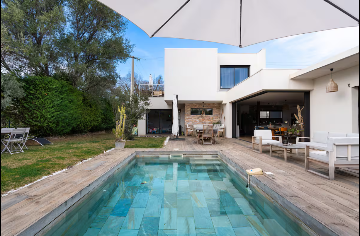 Just 20 minutes from the picturesque port of Cassis, I discovered this superb contemporary house, built entirely on one level in 2019, nestled in the heart of a peaceful and unspoiled environment. Built on a 700 m² landscaped plot facing southwest, this property, located halfway between vineyards and the sea, captivates with its flat-roof architecture, generous volumes, and exceptional brightness.