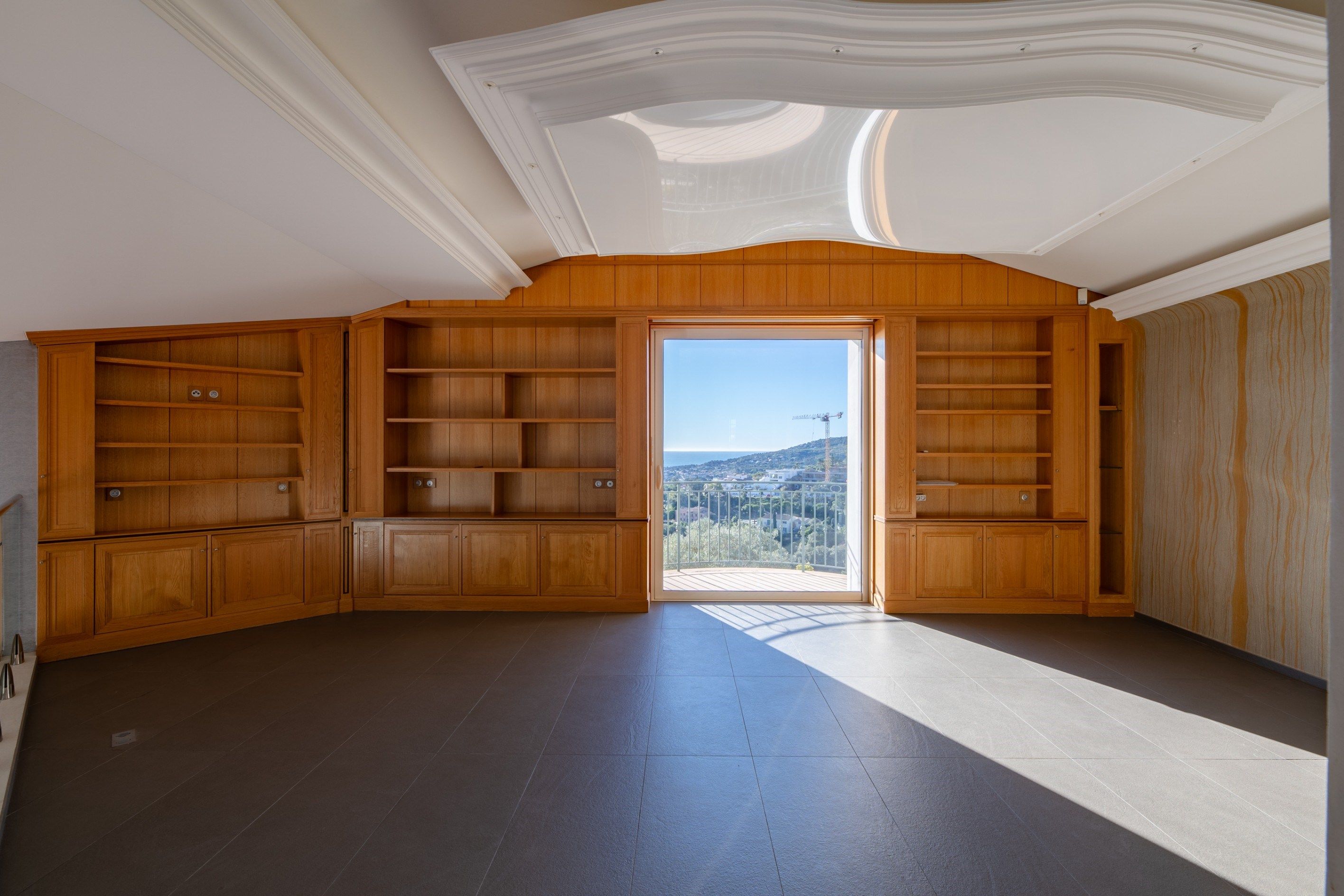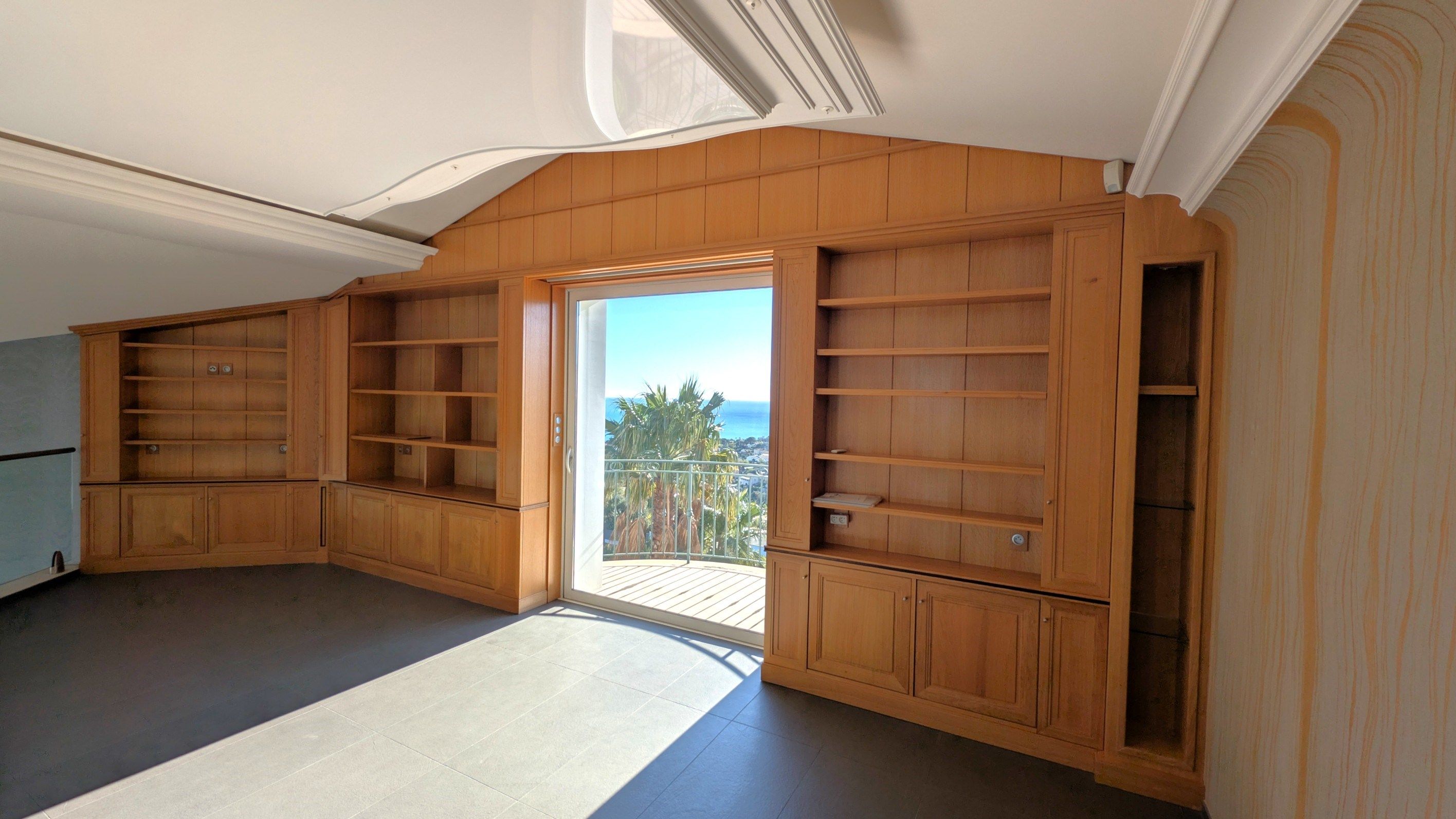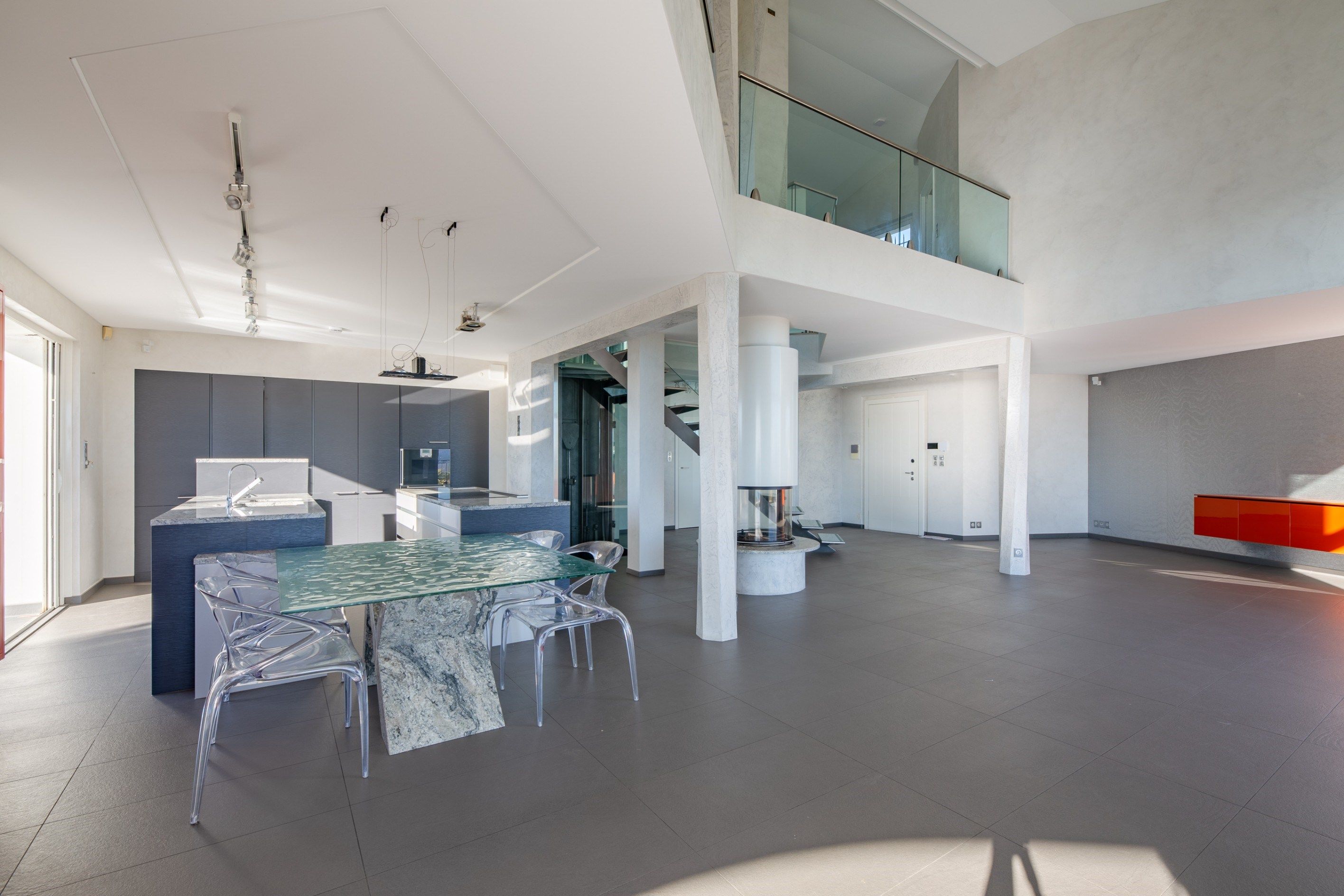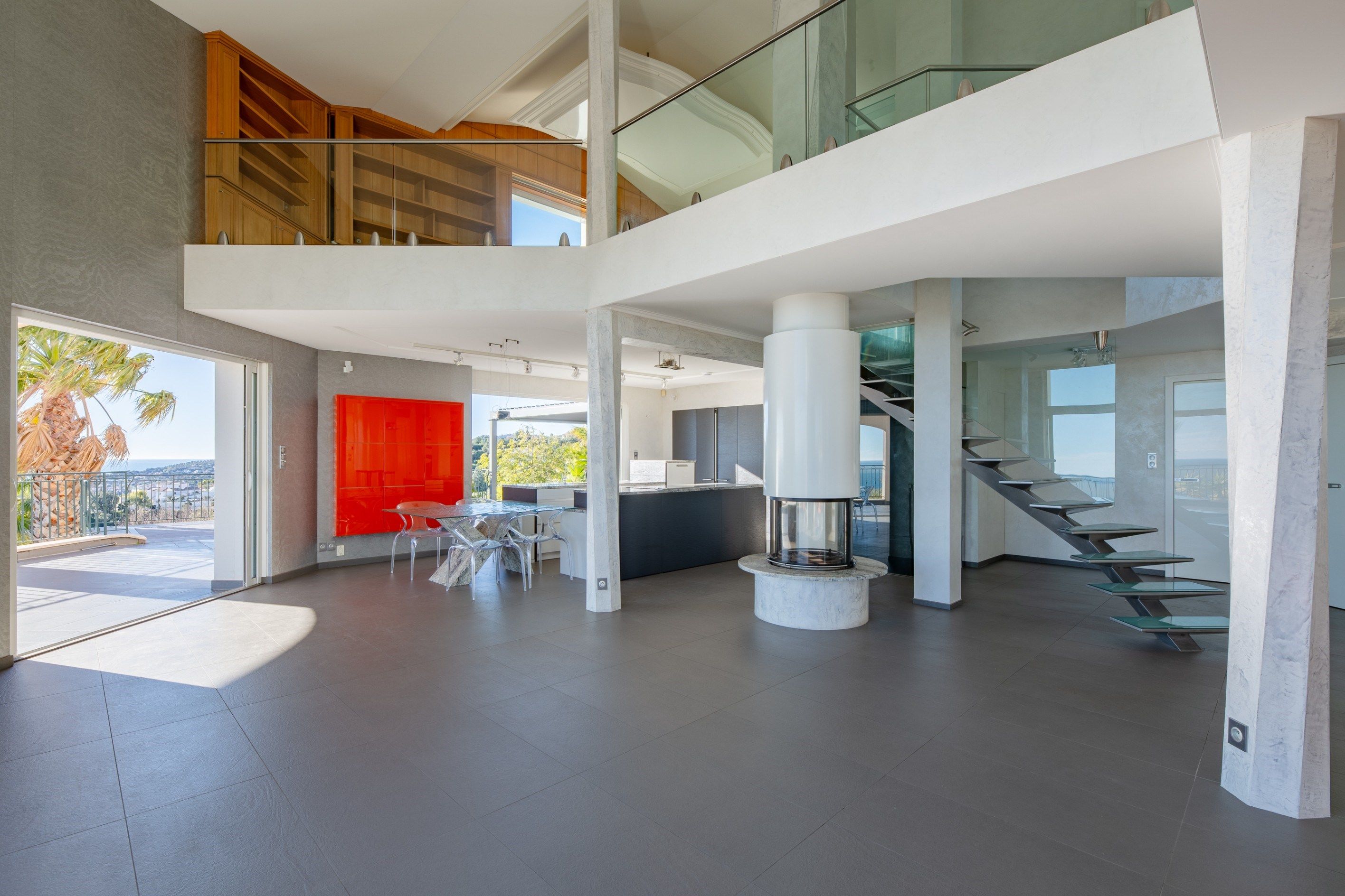 Une grande mezzanine avec balcon surplombe le séjour, apportant une sensation d'espace et de lumière supplémentaires.
